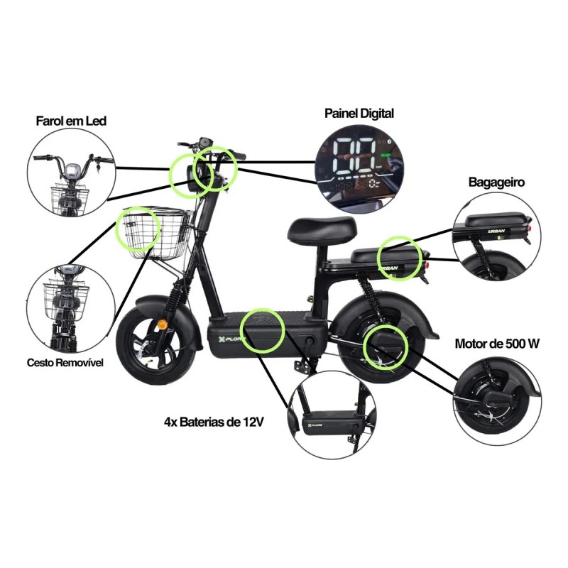 Motor: 500W corrente contínua Bateria: 4x 12V 12Ah (ligação em série) Autonomia aproximada: até 40 km (pode variar conforme uso) Velocidade máxima: até 32 km/h Tempo de recarga: 6 a 7 horas Peso do produto: 44 kg Capacidade de carga: até 120 kg Freios: tambor dianteiro e traseiro Rodas: aro 14 Pneus: 14x2.5 sem câmara Quadro: aço